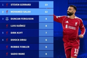 默西赛德郡德比历史射手榜:杰拉德13球、萨拉赫12球、苏牙8球