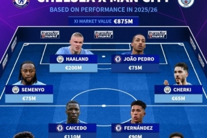 体育资讯4月12日讯 德国转会市场基于球员本赛季的表现,排出了切尔西+曼城阵容,哈兰德、凯塞多、恩佐、多纳鲁马在列。