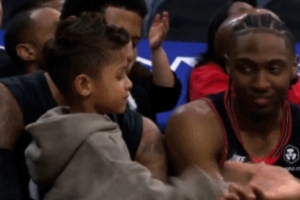 亲子时刻!末节乔治带儿子在替补席 乔治儿子跟马克西等队友互动